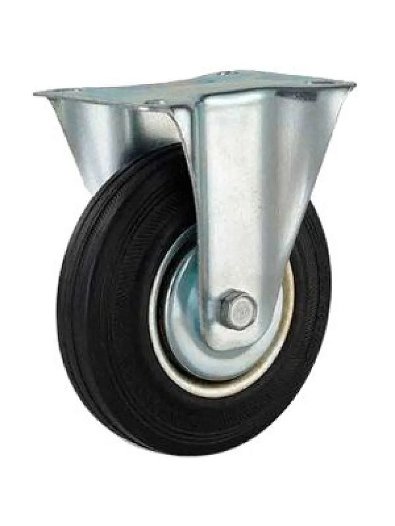 Колеса промышленные неповоротные состоят из колеса (обод – металл, шинка – черная резина) и фиксированной опоры с площадочным креплением.