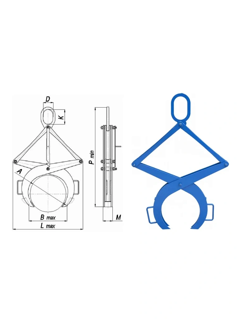 Захват представляет собой конструкцию клещевого типа, предусматривает наличие замка, фиксирующего захват в открытом положении(замок устанавливается на захваты грузоподъемностью свыше 1т и диаметром поднимаемого изделия более 300мм).
