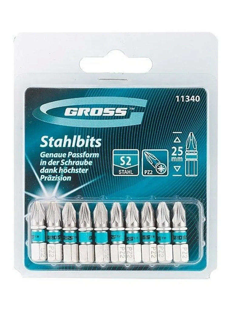 Набор бит торговой марки GROSS предназначен для использования в качестве насадок в ручном и механическом инструменте. Изготовлены биты из высококачественной инструментальной стали марки S2. Твердость бит составляет 58-62 HRС.Основу биты составляет шестигранный хвостовик размером 0,6 см (1/4 дюйма). Длина биты 25 мм, тип шлица — PZ2 (крестообразный с дополнительными направляющими). В качестве защиты от контрафакта на каждой бите присутствует цветное кольцо с логотипом торговой марки GROSS. Набор из десяти бит упакован в жесткую термоформованную пленочную коробку (double blister) размером 105×85 мм.