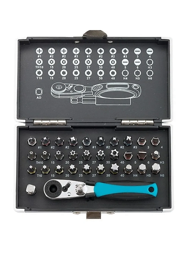 Набор бит с магнитным держателем, с присоединительным размером 1/4 дюйма, 33 предмета из стали S2 в пластиковом кейсе, предназначен для сборки мебели, велосипедов, бытовых приборов, для технического обслуживания автомобилей и прочих монтажных, строительных и слесарных работ.