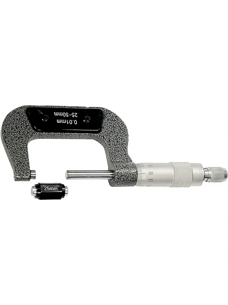 Механический микрометр используется для измерения деталей размером 25-50 мм. Обеспечивает высокую точность результатов — шаг измерения составляет 0,01 мм с допустимой погрешностью ±0,004 мм. Комплектуется установочной мерой, позволяющей при необходимости произвести настройку прибора. Микрометр применяется для определения толщины листового металла, проволоки, различных деталей. Будет полезен на производстве, в слесарной мастерской и автосервисе.