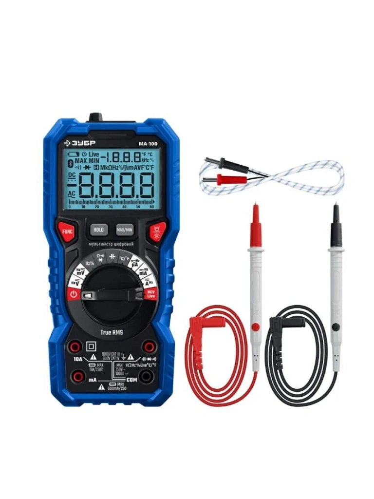 Профессиональный автоматический цифровой мультиметр используется для проведения измерений электрических параметров сети и приборов, обеспечивает высокую точность измерений. Прибор имеет функции измерения переменного и постоянного напряжения, сопротивления, емкости, проверки целостности цепей со звуковым сигналом, проверки диодов, измерения переменного и постоянного тока, измерение частоты до 10 МГц, измерение температуры и режим поиска проводки под напряжением NCV Live.