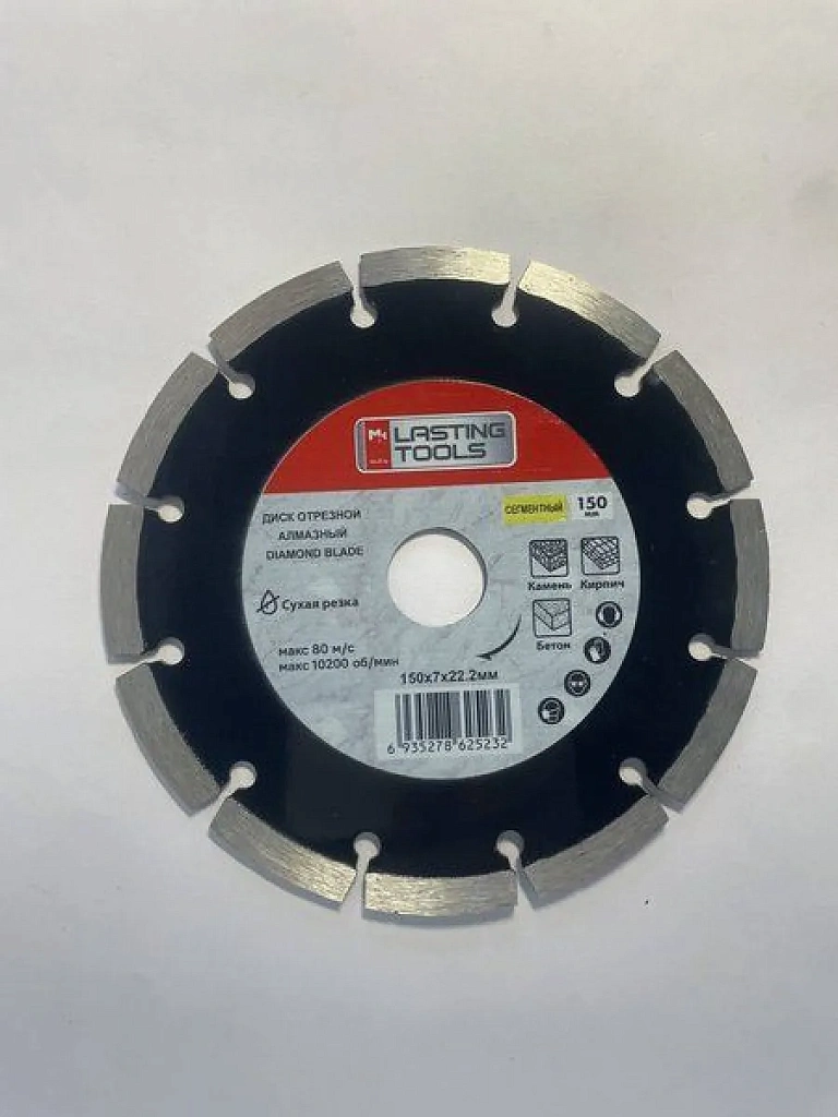 Высокий ресурс реза обеспечивается алмазной крошкой и оптимально подобранной связкой. Благодаря наличию «прорезей» сегментов в диске процесс обработки осуществляется с эффективным выбросом продуктов резания. Диск используется при сухой резке бетона, кирпича.