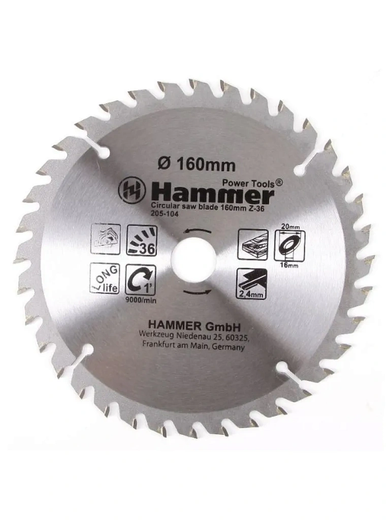 Диск для циркулярной пилы по дереву d=160мм, Z-36, переходное кольцо 20/16мм. Макс. обороты — 9000 об/мин.