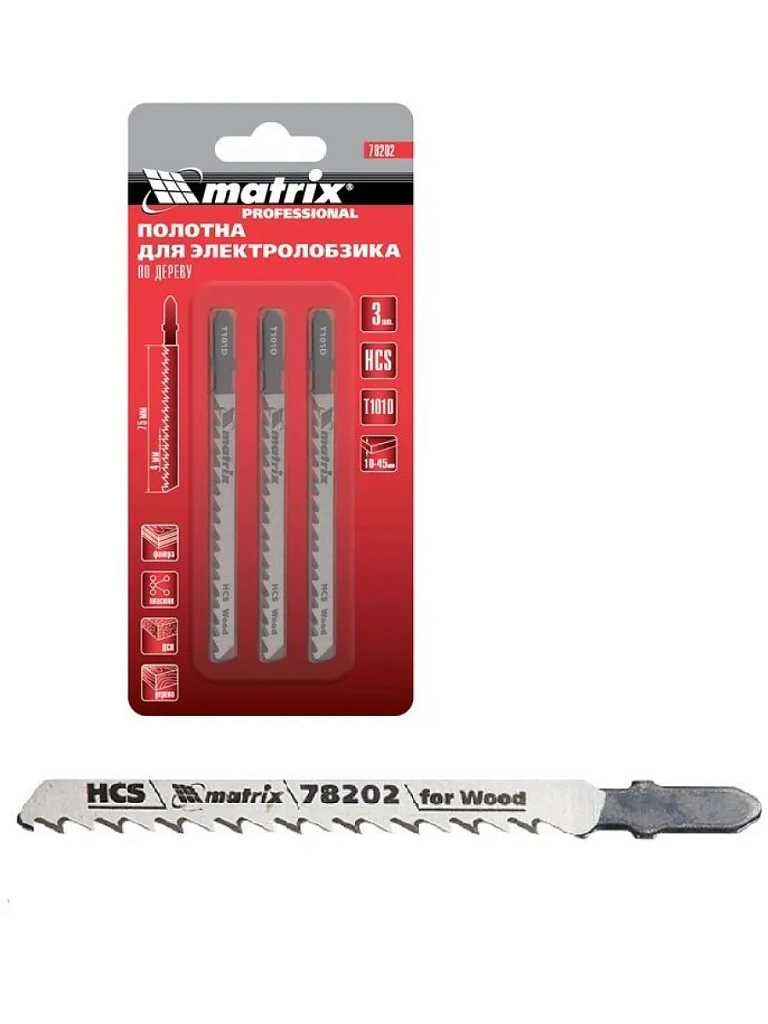 Полотна по дереву Matrix 78202, T101D, 75 х 4,0 мм, HCS, — комплект оснасток для электролобзика из 3 шт. Предназначены для прямого реза фанеры, древесины, ДСП, ДВП и пластика толщиной от 5 до 50 мм. Имеют стандартный Т-образный хвостовик, совместимый с держателями большинства современных моделей электролобзиков. Полотна используются при проведении профессиональных столярных работ, а также будут полезны в быту.