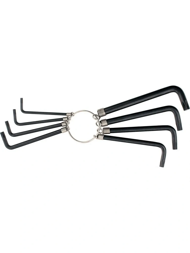 Набор имбусовых ключей c профилем Torx предназначен для монтажа и демонтажа резьбовых соединений. Ключи изготовлены из углеродистой стали, оксидированы. Твердость рабочей части — 45 HRС. Для удобства хранения ключи закреплены на кольце.
