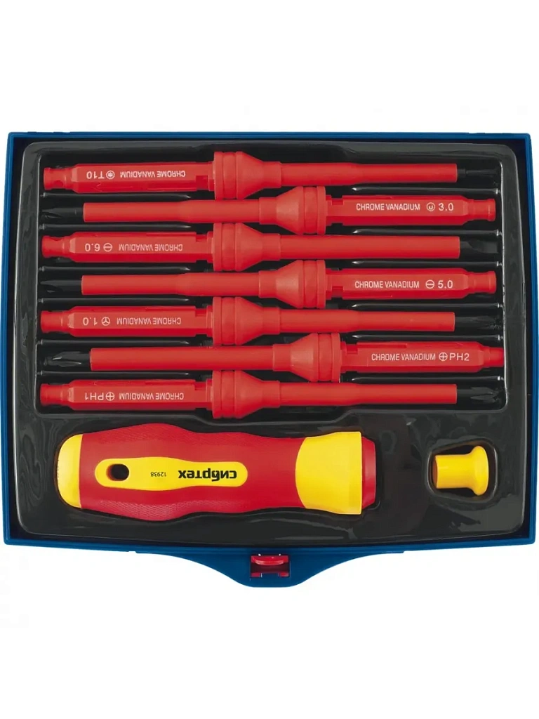 Диэлектрическая отвертка со сменными жалами до 1000 В, из стали CrV, включает 9 предметов: рукоятку и наконечники SL, PH, TR, TW, SPAN с изолирующим покрытием. Полупрофессиональный набор используется мастерами при проведении ремонтных работ. Стержни длиной 100 мм могут проникать в углубления. Внимание — техника безопасности запрещает выполнять работы под напряжением!