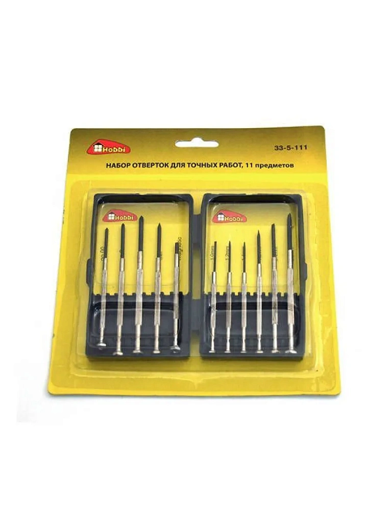 Набор часовых отвёрток, 11 предметов Hobbi 33-5-111 для ремонта часовой техники. В наборе находится 11 предметов: все необходимые насадки для работы с мелкими механизмами.