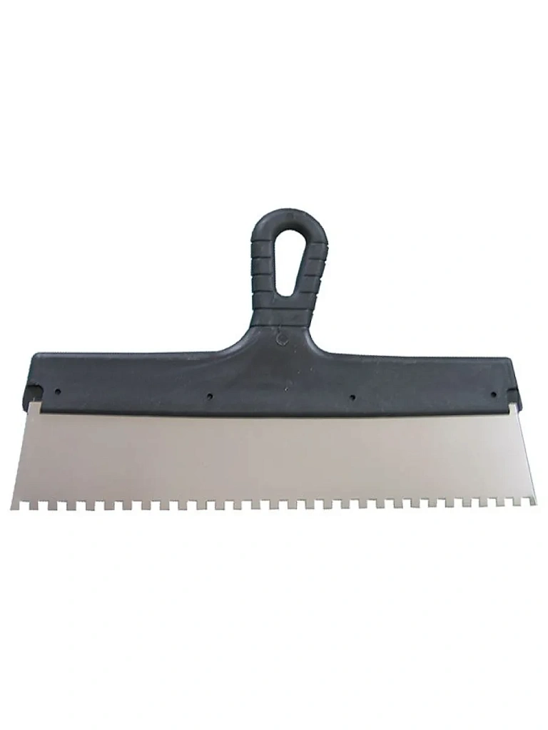 Фасадный шпатель предназначен для нанесения клеевых составов, цементных монтажных смесей при укладывании кафельной плитки, приклеивании стеновых панелей. Полотно с зубьями 10х10 мм подойдет для укладки маленькой и средней по размерам плитки. Прочное полотно шириной 350 мм из нержавеющей стали, позволяет наносить раствор с большой вязкостью. Рукоятка выполнена из пластика и имеет эргономическую форму, что обеспечивает удобство при работе.