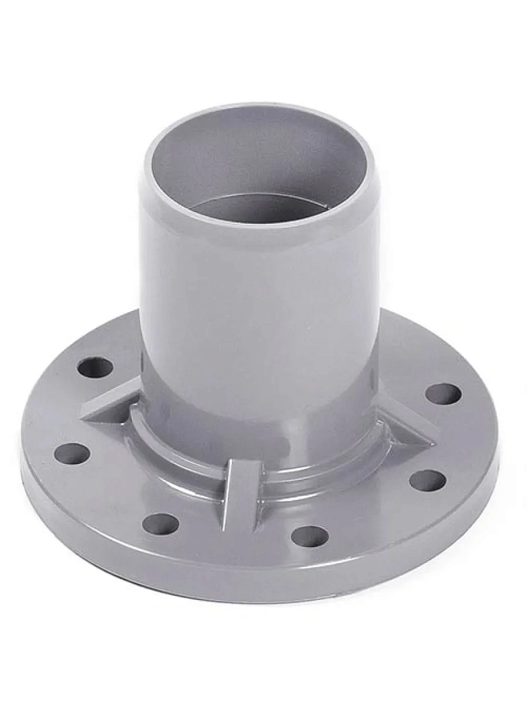 Патрубок раструбный с ПВХ фланцем используется для соединения гладкого конца трубы ПВХ с запорной арматурой, а также для стыковки с трубой из другого материала посредством фланцевого соединения. Конструктивно представляет собой отрезок трубы, имеющий с одной стороны раструб и фланец ПВХ с отверстиями для болтов.