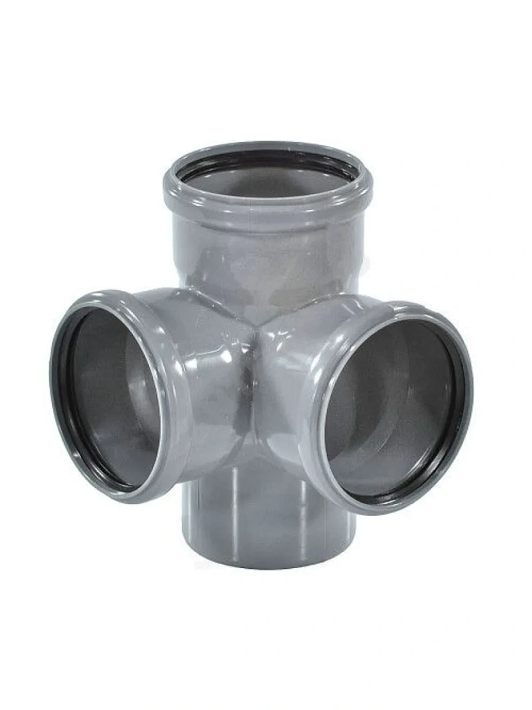Крестовина двухплоскостная 110/110/110х90 используется для слива сточных вод из двух плоскостей помещения без перехода на другой диаметр трубы, а также для отвода агрессивных вод. В качестве уплотнителей используются резиновые кольца манжетного типа с распорным вкладышем. Монтаж желательно производить с применением специальной силиконовой смазки