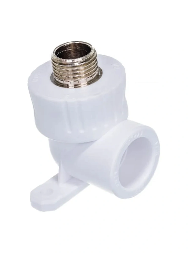 Угольник комбинированный с креплением (водорозетка) с наружной резьбой применяется при монтаже систем отопления и водоснабжения и служит для присоединения полипропиленовой трубы к компоненту системы с внутренней резьбой под углом 90 градусов друг к другу.
