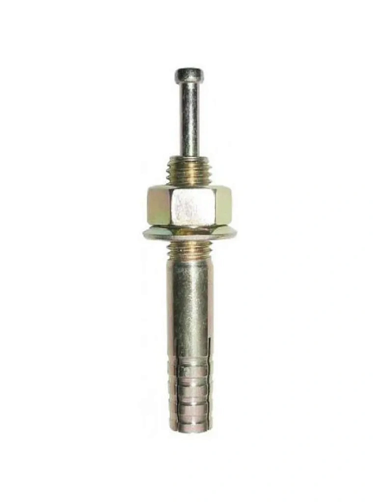 Болт анкерный с распором - это металлическая гильза, на одном конце которой резьба, а на другом - четырёхсегментная распорная часть. На резьбовой части анкерного болта имеется гайка с шайбой. Ещё внутри гильзы имеется гвоздь. Этот гвоздь, забиваясь внутрь анкера, расклинивает его нижнюю часть. Таким образом осуществляется прочная фиксация анкерного болта с ударным распором в отверстии. Болт анкерный с ударным распором изготавливается из желтопассивированной (оцинкованной) стали. Другой вариант - сталь с покрытием из белого цинка.