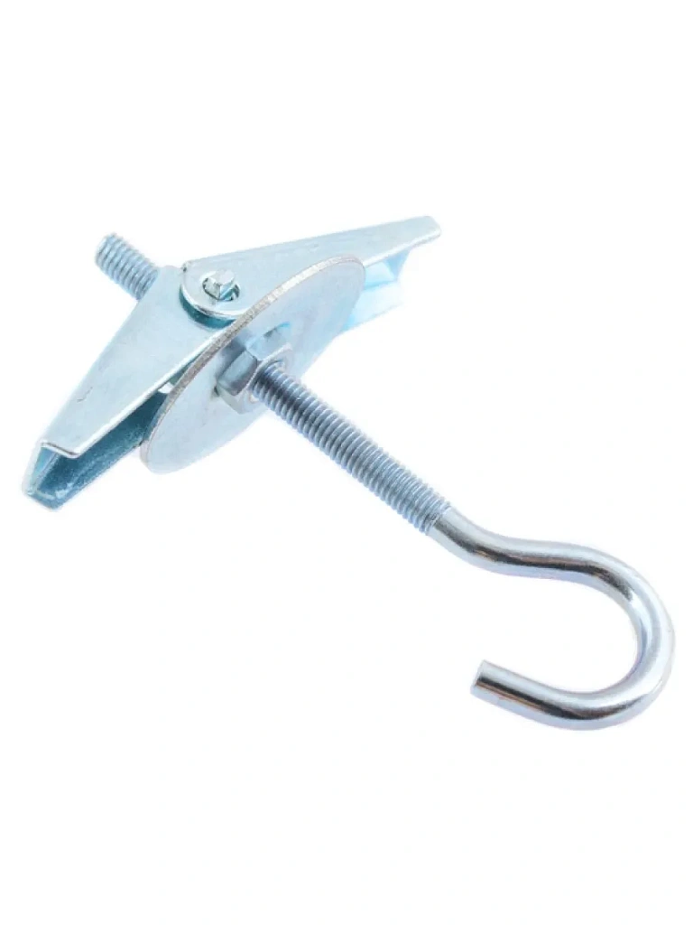 Складной пружинный дюбель с окончанием в виде крюка используется для монтажа люстр, растяжек, кабель-каналов, электроприборов, подвесных элементов декора и других легких строительных конструкций к пустотелым основаниям. Чаще всего в качестве основания выступают подвесные потолки из гипсокартона.