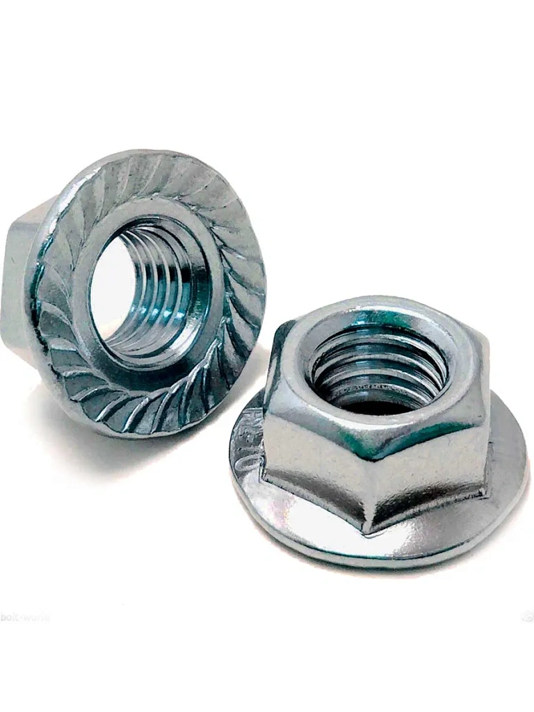Гайка с фланцем применяется в комплекте с болтом или шпилькой в тех случаях, когда необходимо обеспечить увеличенную силу стягивания без установки шайбы, чью роль выполняет фланец, а нанесенные на его дно насечки предотвращают самоотвинчивание.