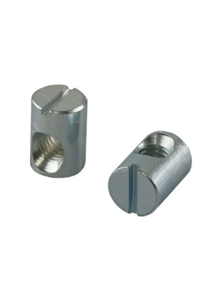 В производстве стульев, столов, детских кроваток производители предпочитают использовать такой элемент мебельного крепежа как муфта «бочонок» Стяжка (муфта) «бочонок» представляет собой стальной цилиндр с боковым отверстием. Отверстие необходимо для вкручивания различных видов винтов. Различают несколько видов и размеров данного изделия. Наша компания предлагает бочонок из стали. Данный материал позволяет создать достаточно прочное соединение, а так же упрощает процесс сборки, за счет магнитных свойств стали. Сборщик при помощи магнитной отвертки, достаточно легко может установить «бочонок» в технологическое отверстие и отрегулировать его в зависимости от положения винта