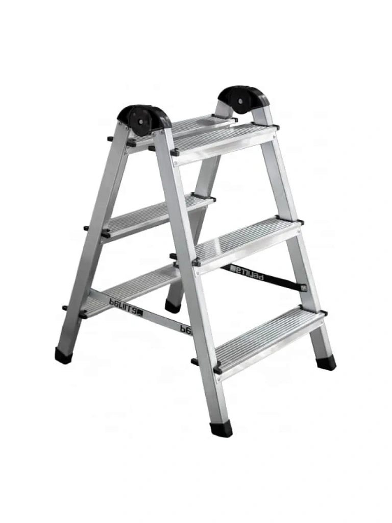 Алюминиевая 3-х ступенчатая двухсторонняя стремянка активно применяется в бытовых условиях, на производстве и строительных площадках.