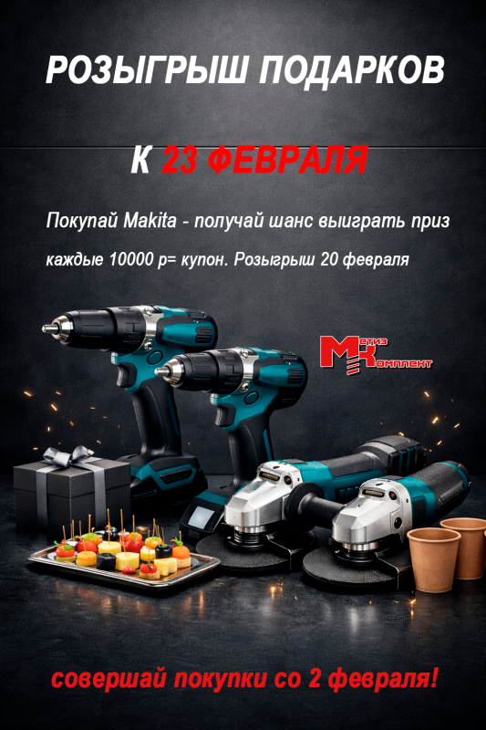 С 02.02 по 20.02 покупайте товары Makita. Важно: участие учитывается только при покупке в одном чеке/счёте (чеки и УПД не суммируются).