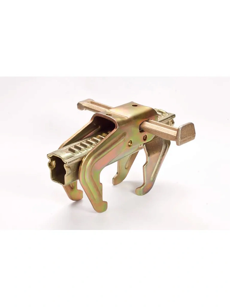 Применяется в тех случаях, когда нельзя использовать клиновой замок по причине увеличенного зазора между щитами. Представляет собой штампованную конструкцию из стали с антикоррозионным покрытием, предназначен для многократного использования с различными типами опалубки. В обиходе получил название "крокодил". Стягивание губок происходит за счет клинового механизма, обеспечивающего надежное скрепление щитов между собой и уменьшение зазора.
