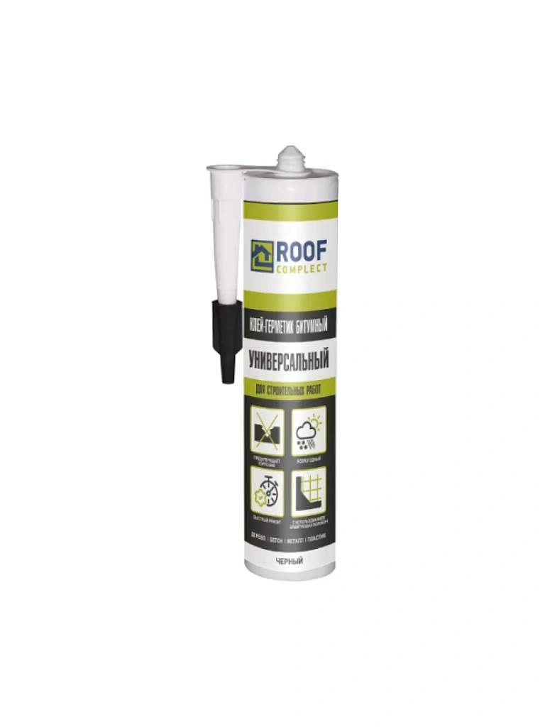 Битумный универсальный клей-герметик Roof Сomplect представлен в черном цвете.