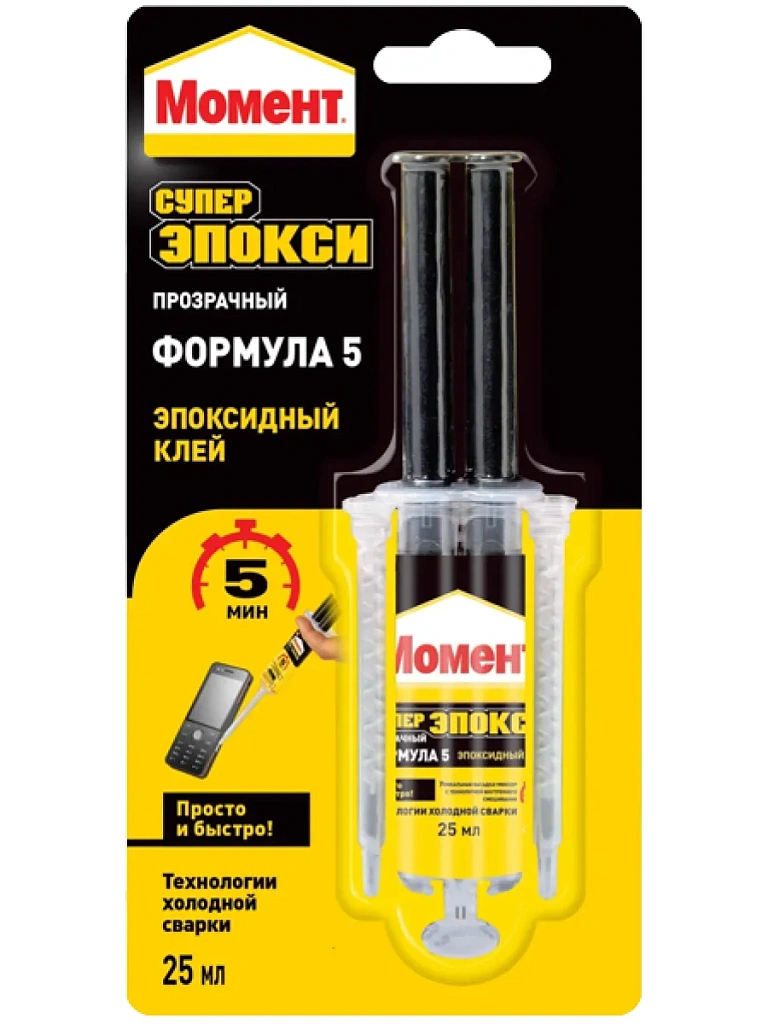 Универсальный эпоксидный клей Момент Супер Эпокси Формула 5 в шприце обеспечит вас комфортным, прочным и быстрым склеиванием при работе практически с любыми материалами.
