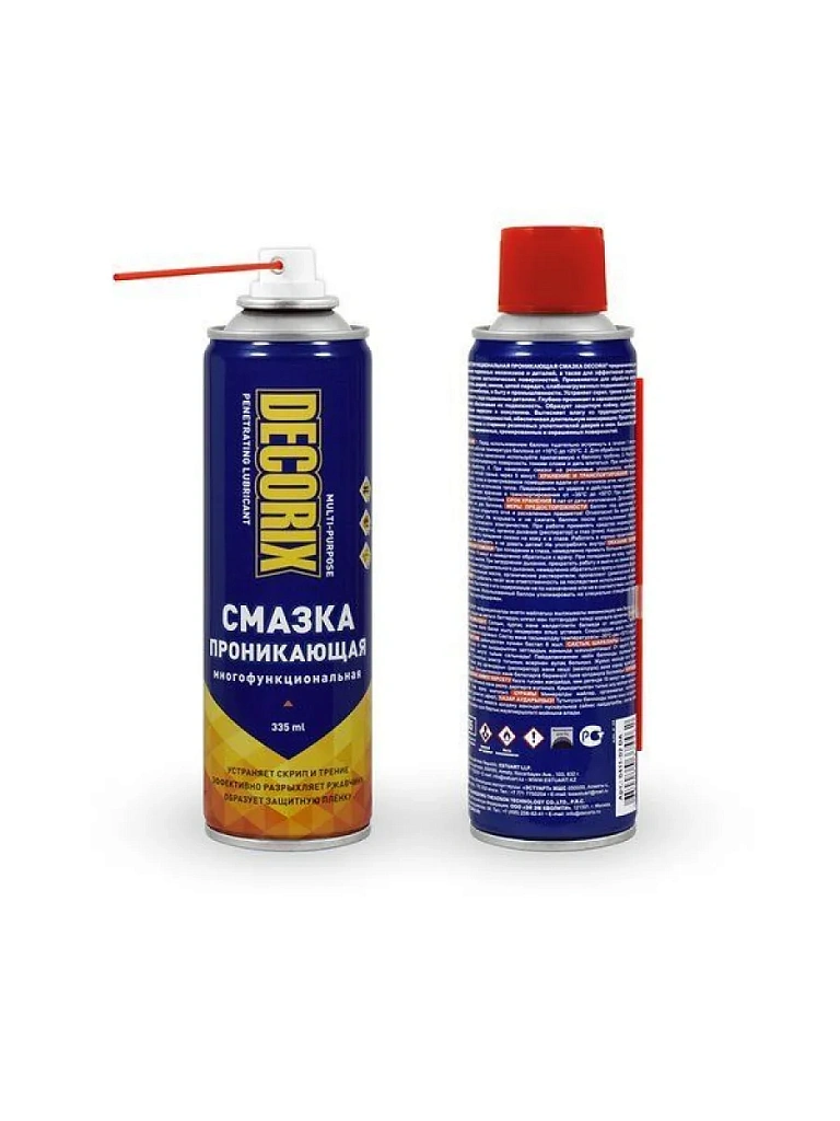 Многофункциональная проникающая смазка DECORIX® 335 мл предназначена для смазывания подвижных механизмов и деталей, а также для эффективной защиты от влаги и коррозии металлических поверхностей. Применяется для обработки шестерёнок, петель дверей, замков, цепей передач, слабонагруженных подшипников и т. п. при уходе за автомобилем, в быту и промышленности.