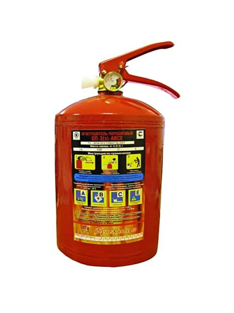 Огнетушители порошковые закачные ОП-3 (з) с массой огнетушащего вещества 3кг предназначены (в зависимости от вида заряженного порошка) для ликвидации пожаров твердых веществ, в основном органического происхождения (класс А); пожаров горючих жидкостей или плавящихся твердых веществ (класс В); пожаров газообразных веществ (класс С), а также пожаров электрооборудования, находящегося под напряжением не более 1000 В (пожар класса Е), при эксплуатации в условиях умеренного климата У, категории 2, тип атмосферы II по ГОСТ 15150.