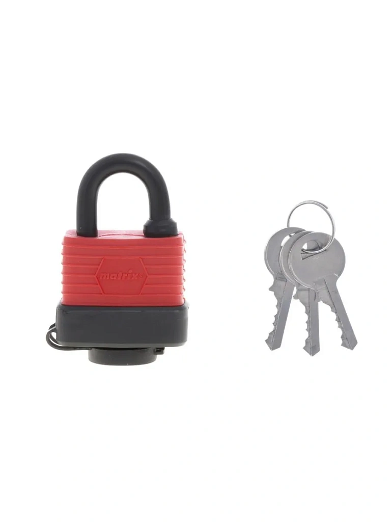 Навесной замок с прочным обрезиненным корпусом. Конструктивные особенности замка (герметизация корпуса и дужки замка, минимальный размер зазоров между деталями, специальная крышка на ключевой блок) значительно повышают его стойкость к атмосферным осадкам, предупреждая коррозию и продлевая срок службы. Закаленная дужка и сложная конструкция корпуса снижают вероятность взлома. В комплекте 3 ключа.