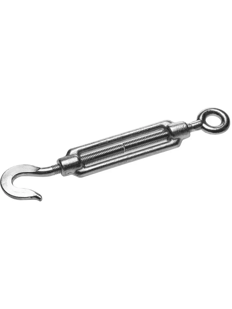 могут применяться для быстрой временной фиксации переносного оборудования, которое подвергается значительным вибрационным нагрузкам. А так же для укрепления растяжек палаток и навесов, временной фиксации радиопередающих мачт. Материал изготовления талрепа – нержавеющая сталь марки А4. Она является кислотостойкой и слабо подвержена влиянию отрицательных температур, изделие может успешно функционировать при -40°С и ниже. Длинна крепежа от 120 до 440 мм. Приспособление в состоянии сделать выборку слабины длинной от 70 до 300 мм. Внутренний диаметр петли 8-30 мм позволяет крепить изделие к анкерам большого сечения, а расстояние проема крюка 8-18 мм позволяет применять такелажные тросы значительных диаметров.